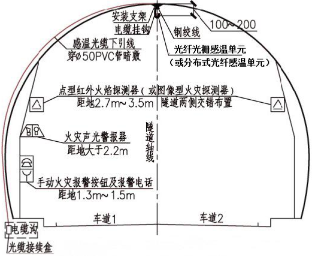城市道路隧道、特長雙向公路隧道和道路中的水底隧道,應同時采用線型光纖感溫火災探測器和點型紅外火焰探測器(或圖像型火災探測器);其他公路隧道應采用線型光纖感溫火災探測器或點型紅外火焰探測器。