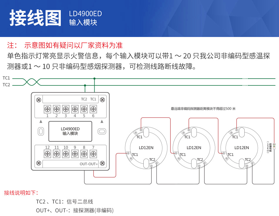4、每個LD4900ED輸入模塊可以帶1~20只利達公司非編碼型探測器。